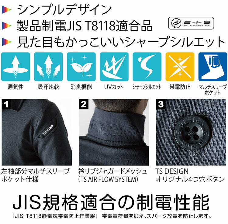 ■TS DESIGN ESロングスリーブポロシャツ 4075 シンプルデザイン 製品制電JIS T8118適合品 見た目にかっこいいシャープシルエット 素材:ESドライ鹿の子(電動繊維混入) ポリエステル70%、綿30% モニター環境により画像の色と現物の色が多少違って見えます。